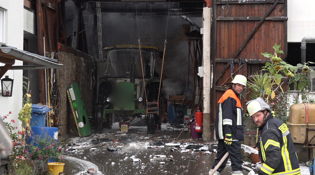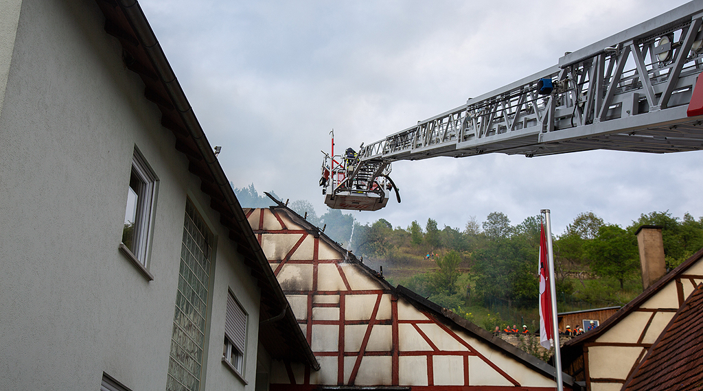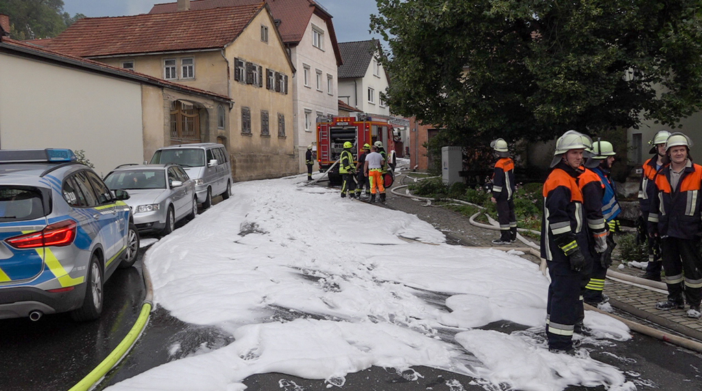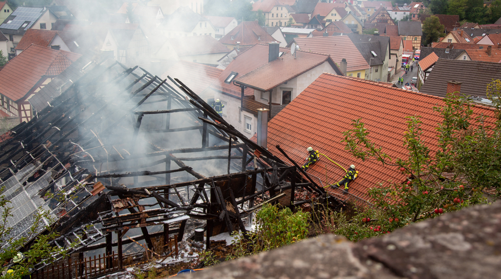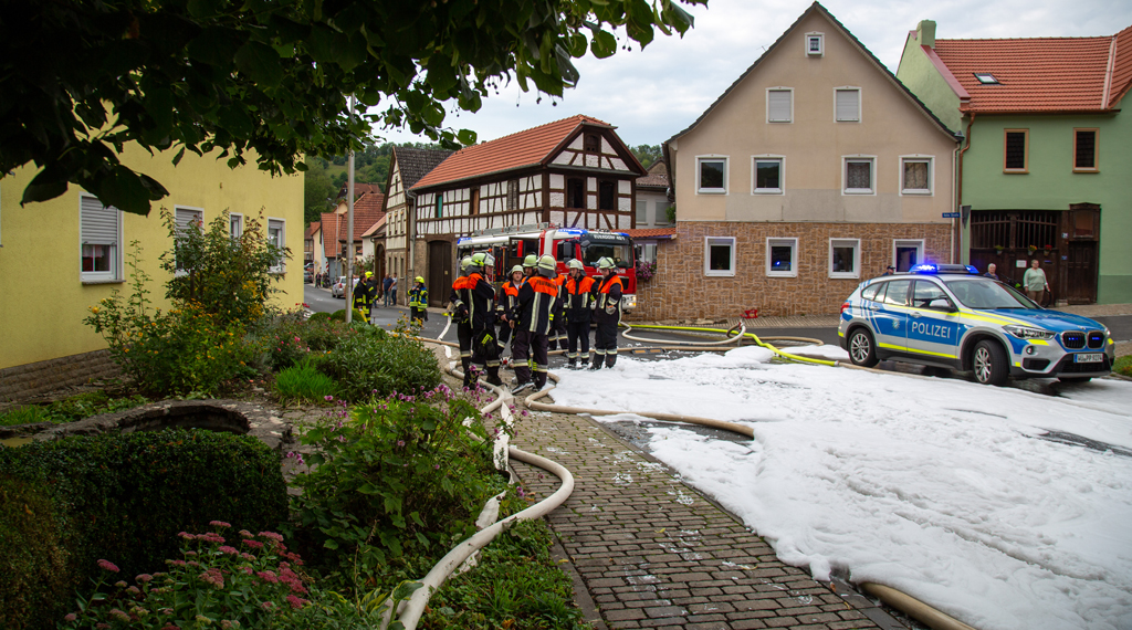 "Es war ein riesige Leistung der Feuerwehrkräfte", lobt Einsatzleiter Marcel Paries seine Kameraden. Nur mit Mühe war es ihnen gelungen, ein großes Feuer mitten im historischen Ortskern nicht zu einem Inferno werden zu lassen. Gegen 17.00 Uhr war der Brand ein Scheune in Sultzhal (LK Bad Kissingen) gemeldet worden. Der Einsatz gestaltete sich als vielfache Herausforderung: Zum einen zündete der Dachstuhl des großen Fachwerkgebäudes zum Eintreffen der Feuerwehr durch, so das offene Flammen durch das Dach schlugen. Zum anderen war das Objekt nur von einer Seite über eine enge Hofeinfahrt zugänglich und von fast allen Seiten direkt angrenzend durch Wohnhäuser umbaut. Die Feuerwehrkräfte kletterten schließlich sogar auf Dächer umliegender Häuser, um von dort ein Übergreifen zu verhindern, zudem wurden von der Rückseite von einer am Hang liegenden Dorfmauer ein Zugang gebaut. Dank des raschen und sehr engagierten Einsatzes konnte ein Ausbreiten so zügig eingedämmt werden, dass alle Nachbarhäuser nur leichte Hitzeschäden davontrugen, aber bewohnbar blieben. Fachberater vom THW wurden hinzugezogen, um die Einsturzgefahr des Gebäudes zu prüfen, zudem wurdem im weiteren Verlauf Schaummittel eingesetzt, um das Stroh löschen zu können. Der Schaum floss schließlich die Hangstraßen hinab und musste aufgefangen werden, um nicht das Abwasser zu kontaminieren. Über 100 Löschkräfte waren im Einsatz. Die Scheune selber brannte bis auf die Grundmauern nieder, darin neben Heu und Stroh auch Gerätschaften und ein Traktor. Die Brandursache ist noch unklar. +++