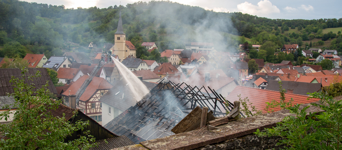 "Es war ein riesige Leistung der Feuerwehrkräfte", lobt Einsatzleiter Marcel Paries seine Kameraden. Nur mit Mühe war es ihnen gelungen, ein großes Feuer mitten im historischen Ortskern nicht zu einem Inferno werden zu lassen. Gegen 17.00 Uhr war der Brand ein Scheune in Sultzhal (LK Bad Kissingen) gemeldet worden. Der Einsatz gestaltete sich als vielfache Herausforderung: Zum einen zündete der Dachstuhl des großen Fachwerkgebäudes zum Eintreffen der Feuerwehr durch, so das offene Flammen durch das Dach schlugen. Zum anderen war das Objekt nur von einer Seite über eine enge Hofeinfahrt zugänglich und von fast allen Seiten direkt angrenzend durch Wohnhäuser umbaut. Die Feuerwehrkräfte kletterten schließlich sogar auf Dächer umliegender Häuser, um von dort ein Übergreifen zu verhindern, zudem wurden von der Rückseite von einer am Hang liegenden Dorfmauer ein Zugang gebaut. Dank des raschen und sehr engagierten Einsatzes konnte ein Ausbreiten so zügig eingedämmt werden, dass alle Nachbarhäuser nur leichte Hitzeschäden davontrugen, aber bewohnbar blieben. Fachberater vom THW wurden hinzugezogen, um die Einsturzgefahr des Gebäudes zu prüfen, zudem wurdem im weiteren Verlauf Schaummittel eingesetzt, um das Stroh löschen zu können. Der Schaum floss schließlich die Hangstraßen hinab und musste aufgefangen werden, um nicht das Abwasser zu kontaminieren. Über 100 Löschkräfte waren im Einsatz. Die Scheune selber brannte bis auf die Grundmauern nieder, darin neben Heu und Stroh auch Gerätschaften und ein Traktor. Die Brandursache ist noch unklar. +++