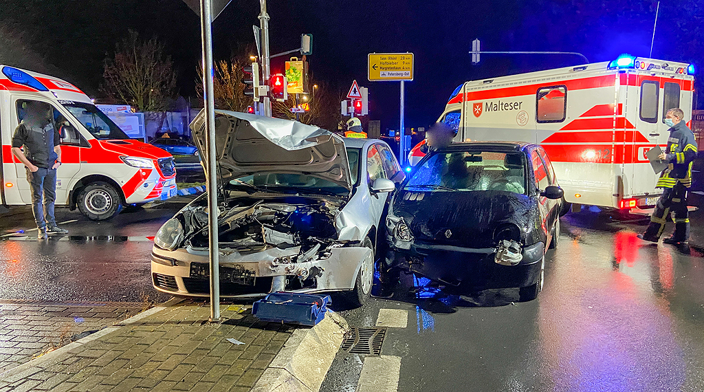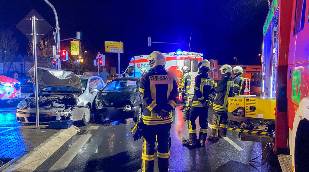 Zu einem schweren Unfall kam es am Dienstagabend um kurz nach 18 Uhr in Petersberg an der Kreuzung am Justus-Liebig-Center – zwei Personen wurden dabei verletzt. Um 18.18 Uhr informierte die Leitstelle Fulda, dass zwischen Petersberg und Margretenhaun nach einem Unfall eine Person in einem Pkw eingeklemmt wurde. Beim Eintreffen der Polizei war jedoch niemand mehr in seinem Fahrzeug eingeklemmt. Nach Angaben der Polizei vor Ort überfuhr ein 20-jähriger Fahranfänger aus Künzell in seinem silbernen VW Golf eine rote Ampel und übersah dabei eine 51-Jährige aus Fulda in ihrem schwarzen Renault Twingo, die nach links nach Margretenhaun abbiegen wollte. Beim Zusammenstoß wurde der Unfallverursacher mittelschwer, die Twingo-Fahrerin leicht verletzt. Vor Ort waren drei Rettungswagen und die Polizei sowie die Feuerwehr Petersberg. Den entstandenen Sachschaden beziffert die Polizei auf rund 10.000 Euro. +++ sw