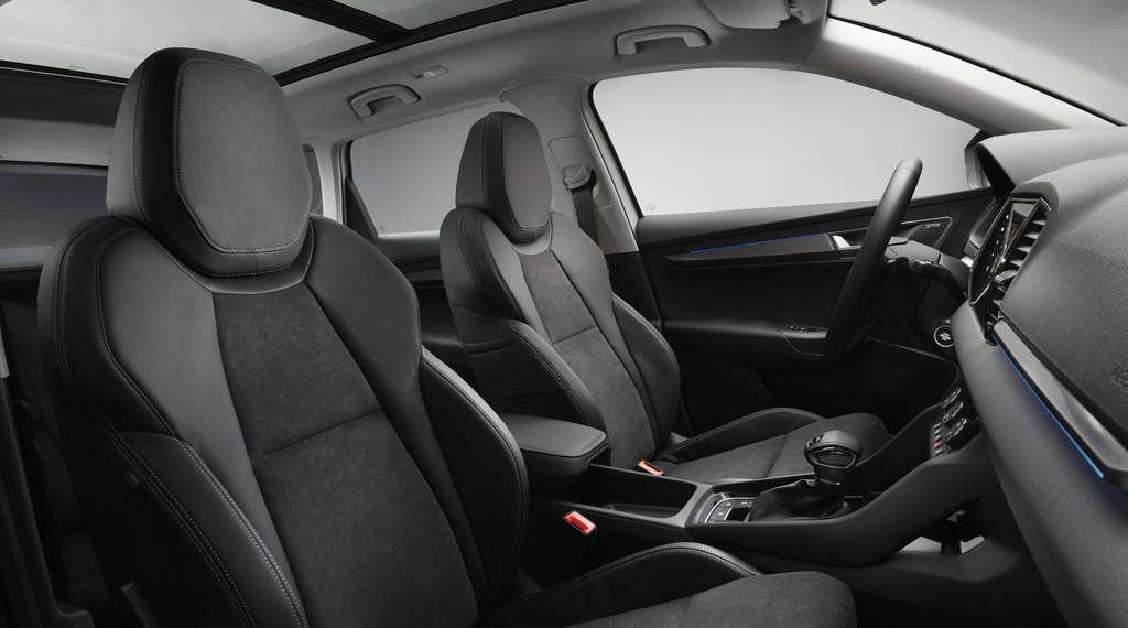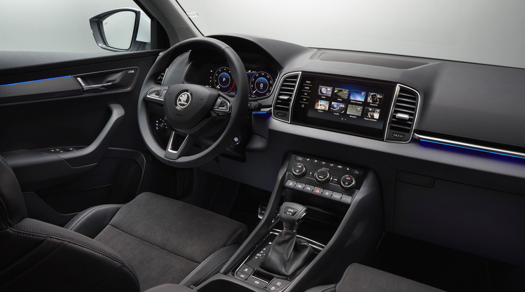 Auch der Karoq punktet nicht mit Effekthascherei, aber durchaus mit wertigen Akzenten wie Chromrahmen, hochglänzenden schwarzen Flächen unten in der Mittelkonsole oder oben beim Touchscreen des großen Navi. Darüber spannt sich breit und schmal der Armaturenträger in dem üblichen zurückhaltenden und angenehmen Stil des Hauses. Unser Karoq-Exemplar verfügte über das virtuelle Cockpit des Konzerns mit seinen vielfachen Möglichkeiten, Karten, Anzeigen und auch Ambientebeleuchtung zu kombinieren. Das frei programmierbare digitale Instrumentenpanel, das Multifunktions-Lenkrad und Leder-Ausstattung mit Alcantara-Elementen tragen zu einem Raumerlebnis bei, dass niemanden aufregt, aber jedem vertraut und zeitgemäß erscheint.