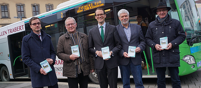 Daniel Vollmann (Geschäftsführer Lokale Nahverkehrsgesellschaft Fulda mbH), Dr. Albert Post (Vorsitzender des Ausschusses für Wirtschaft und Verkehr in der Fuldaer Stadtverordnetenversammlung), Stadtbaurat Daniel Schreiner, Martin Thaler (Stadtplanungsamt –Stadtentwicklung) und Reiner Wunderlich (Prokurist RhönEnergie Bus GmbH) (v.l.)
