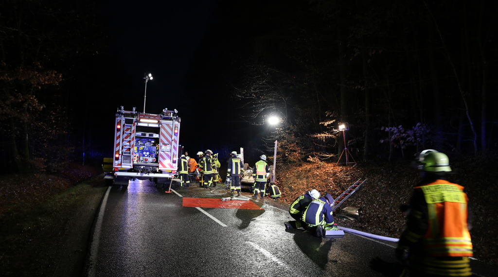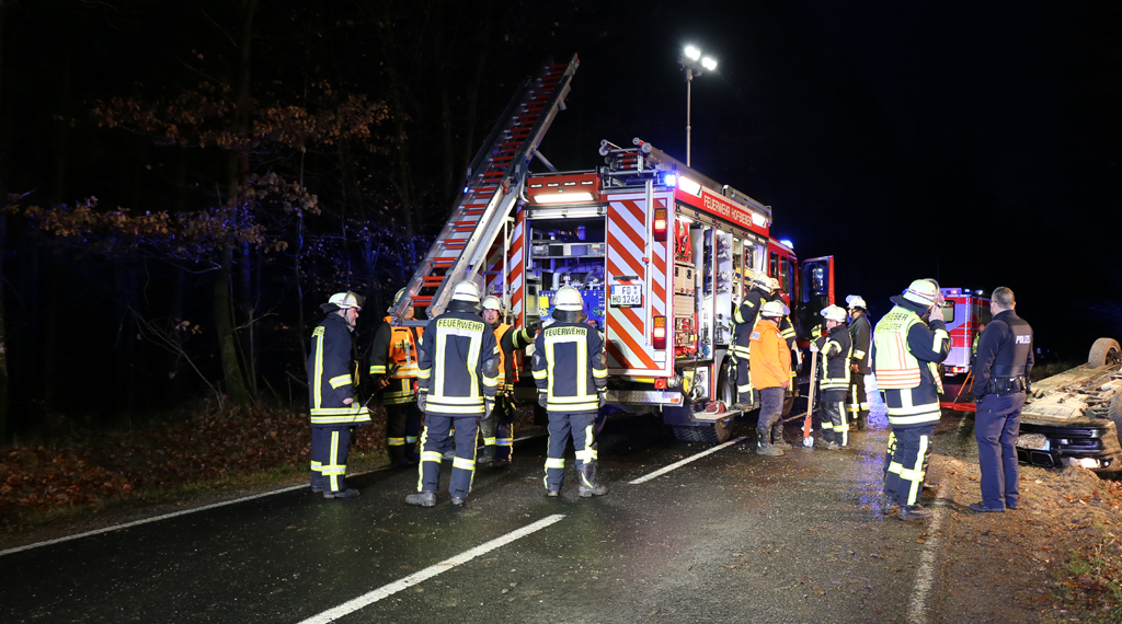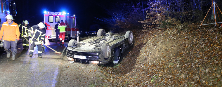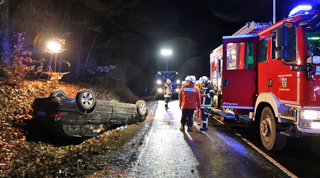 Gegen 16.25 Uhr ereignete sich ein Verkehrsunfall auf Landstraße zwischen Morles und Hofbieber, bei dem sich ein Fahrzeug überschlug. Der Fahrer eines BMW hatte sich offenbar mit der Geschwindigkeit verschätzt und verlor an einer Kuppel mitten im Waldgebiet die Kontrolle über sein Fahrzeug. Der Wagen überschlug sich mehrfach und blieb anschließend zwischen Waldgebiet und Hang auf dem Dach im Graben liegen. Der Fahrer wurde dabei eingeklemmt und schwer verletzt. Die Feuerwehr musste ihn über die Beifahrerseite herausschneiden. Durch die Dachlage des Fahrzeugs und dadurch, dass es im Graben lag, musste der BMW erst gegen Abrutschen gesichert werden, bevor die Rettungsarbeiten durchgeführt werden konnten. Der Patient wurde anschließend an den Rettungsdienst übergeben und ins Krankenhaus gebracht. Die Feuerwehr sperrte die Straße für die Einsatzdauer für den Verkehr ab. +++
