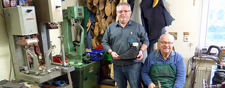 Josef Möller (rechts) geht auch heute noch gerne an seine alte Wirkungsstätte zurück, obwohl Sohn Wolfgang (links) für den orthopädischen Bereich eine weitere Werkstatt eingerichtet hat. Foto: P. Bickert