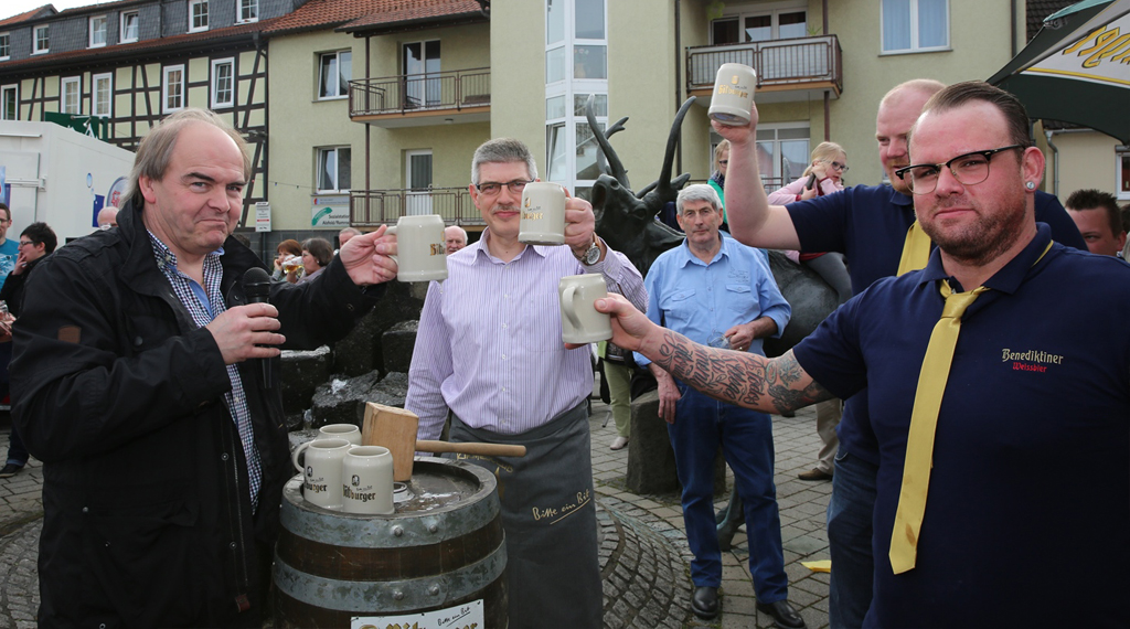 Prost hieß es für die Kirmesburschen mit Landrat Görig und Brauereivertreter Müller