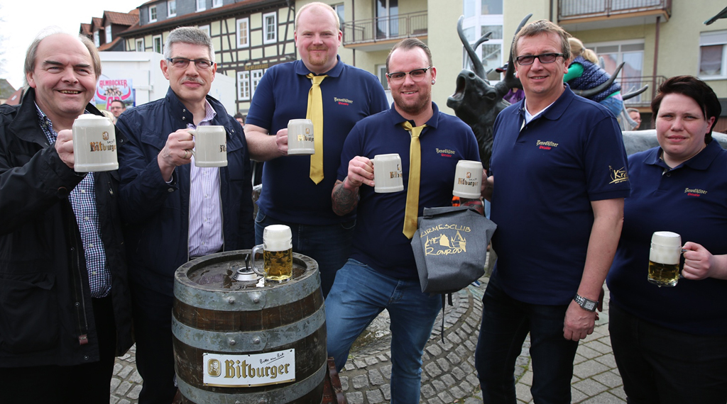 von Links: Brauereivertreter Edgar Müller, Landrat Manfred Görig, Kirmeschefs Rainer Weitzel und Daniel Klingelhöffer sowie Spender Frank Trebert