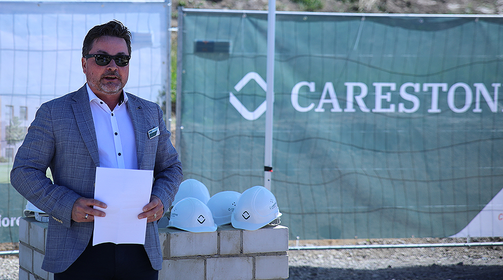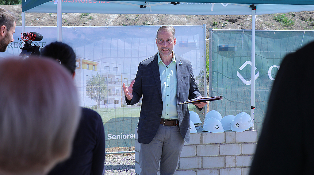 Der Geschäftsführer Projektmanagement Carestone Projekt I GmbH, Dipl.-Ing. Mark Uhmeier, gab heute einen kurzen Überblick über die bisher geleistete Arbeit. Das Projekt reicht in seinen Anfängen bis ins Jahr 2019 zurück. Da man auf „der Grünen Wiese“ baut, galt es im Vorfeld mit der Gemeinde und dem Landkreis diverse Dinge abzuklären. Uhmeier berichtete u.a. von einem „größeren Planungsvorlauf“. „Dieser Planungsvorlauf mündete damit, dass wir im Herbst 2022 die ersten Kaufvertragsentwürfe verhandelt haben.“ Konkrete Planungen durch den Architekten nahmen dann ab Mitte des Jahres 2020 Gestalt an. Den Bauantrag am 14. Februar gestellt, dauerte es keine drei Monate, bis das Unternehmen seine Baugenehmigung bekam. „Etwas, in diesen besonderen Zeiten, in denen wir uns aktuell befinden, nicht selbstverständliches.“ Die Zusammenarbeit mit allen Beteiligten habe bisher einwandfrei funktioniert, „und ich wünsche mir natürlich, dass das auch in Zukunft Bestand hat“, so Mark Uhmeier, der weiter ausführte: „Das, was hier entsteht, reiht sich für die Carestone ein in eine Reihe zahlreicher Projekte. So werden in diesem Jahr 37 Projekte realisiert. Doch dieses Projekt stich von all diesen Projekten heraus.