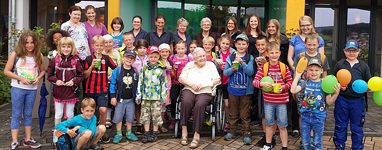 Nach einer kurzen Begrüßung bekamen die Kinder während einer Führung durch das Pflegezentrum auf unterhaltsame Weise einen Eindruck davon vermittelt, was altersbedingte Veränderungen bewirken und was es bedeutet, Hilfe im Alter zu benötigen. Beim Spaziergang durch die Außenanalage beispielsweise wurde die Zeit gestoppt und so lernten die Kinder, dass sie diesen Weg in ihrem normalen Tempo in etwa sieben Minuten schaffen, während die Senioren für denselben Weg um die 30 Minuten benötigen. Auch merkten die kleinen Gäste schnell wie schwer es ist, sich einen Ball mit geschlossenen Augen zuzuwerfen und erfuhren, dass viele der Senioren im Pflegezentrum nur noch sehr schlecht sehen. Pflegebetten, Stuhlwaagen und Rollatoren wurden getestet und viele Fragen wie beispielsweise warum das Personal unterschiedliche Kleidung trägt, worum es sich bei einem Hochbeet handelt oder was wohl ein Pflegebett kostet, wurden diskutiert und beantwortet.