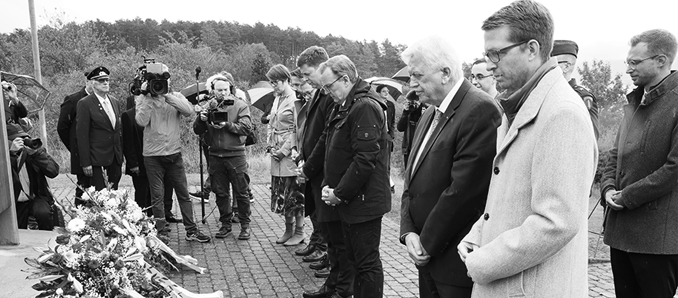 Vorangegangen war dem Festakt in der Fahrzeughalle eine Kranzniederlegung unter Mitwirkung der Kyffhäuser – und Reservistenkameradschaft Grüsselbach mit dem Vorsitzenden Alfred Gollach sowie der Soldatenkameradschaft 1888 Fulda unter der Leitung von Jürgen Storch am Denkmal der deutschen Teilung und der Wiedervereinigung. Die Landtage und Staatskanzleien der Länder Thüringen und Hessen sowie die Landkreise Wartburgkreis und Fulda gedachten mit Gestecken der Grenzopfer. Erinnert wurde beim gestrigen Festakt aber auch an mutige Bürgerinnen und Bürger, die vor 35 Jahren mit der Friedlichen Revolution die Grenzöffnung erst möglich gemacht hatten.