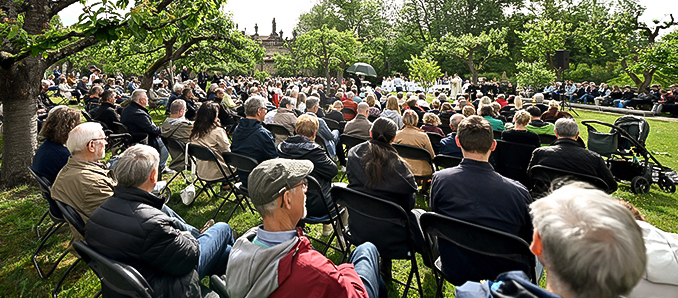 Ein feierlicher Festgottesdienst fand in Fulda am Hochfest Christi Himmelfahrt statt. Stadtpfarrer Stefan Buß zelebrierte den Gottesdienst unter freiem Himmel. Viele Gläubige kamen in den Apfelgarten und nahmen an der anschließenden Prozession teil. Der Kinder- und Jugendchor sowie der Stadtpfarrchor der Innenstadtpfarrei Fulda gestalteten den Gottesdienst musikalisch.