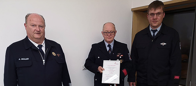 Gemeindebrandinspektor Martin Fischer und Wehrführer Daniel Dreijalts überreichten nach den Grußworten Jonah Laibold die Ernennungsurkunde zum Hauptfeuerwehrmann. Alexander Schmitt wurde mit der Plakatte des Kurhessisch-Waldeckschen Feuerwehrverbandes in Bronze für 25 Jahre aktiven und pflichttreuen Dienst in der Feuerwehr durch André Müller geehrt. Eine besondere Ehre wurde Leo Eismann zuteil. Das Gründungsmitglied der Eichenzeller Jugendfeuerwehr wurde für seinen jahrelangen Einsatz für die Eichenzeller Brandschützer zum Ehrenmitglied ernannt. André Müller ging auf die vielfältigen Stationen von Eismann ein. So war er unter anderem als Jugendfeuerwehrwart und stellvertretender Schriftführer Mitglied des Vorstandes. Er engagierte sich aber auch als Getränkewart und Mitglied des Festausschusses zum 100-jährigen Jubiläum der Feuerwehr, für das er auch die Festschrift erstellte. Unvergessen ist seine langjährige Tätigkeit als Atemschutzgerätewart, bei dem er sich in besonderer Weise für die Sicherheit der Eichenzeller Brandschützer einsetzte. Vorsitzender André Müller und sein Stellvertreter Christopher Penzel überreichten Leo Eismann die entsprechende Ernennungsurkunde, sowie ein Präsent. Zum Abschluss der Jahreshauptversammlung wagte Müller noch einen Blick in das begonnene Jahr und die geplanten Veranstaltungen. Anschließend lud er die Anwesenden zum traditionellen Imbiss ein und wünschte allen Mitgliedern ein gutes Jahr 2022. +++ pm