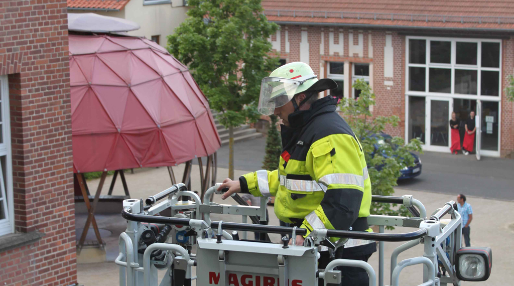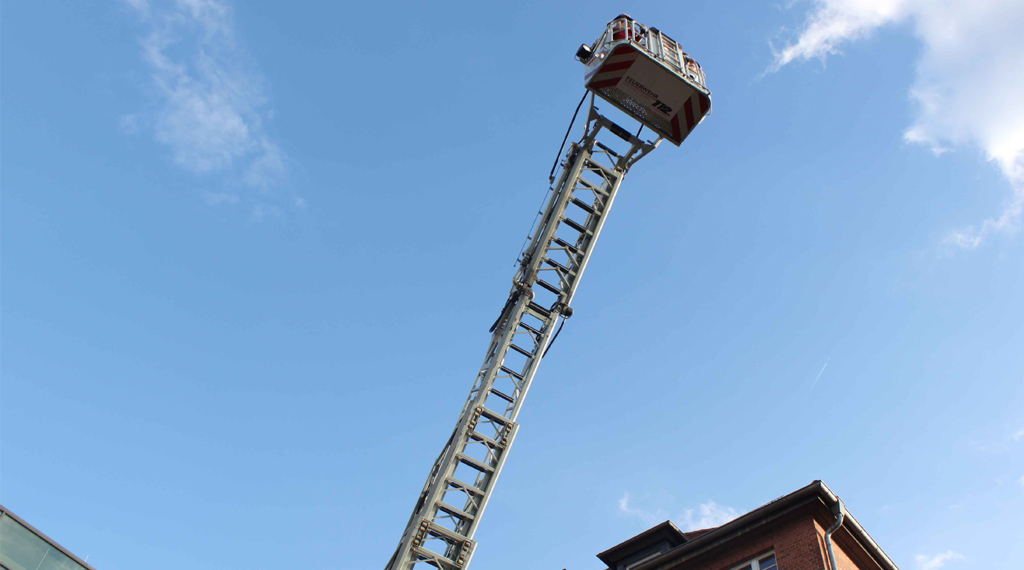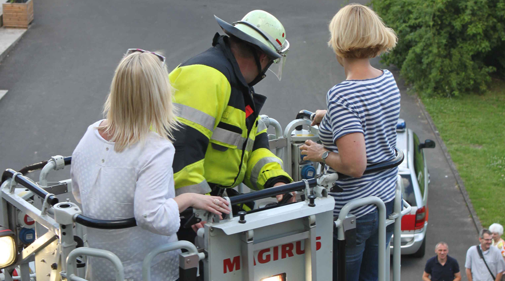 Was viele noch zuvor noch mit Staunen betrachtet haben, wird zum Ende des Einsatzes hin zur ultimativen Mutprobe für viele: Bewohner, Mitarbeiter und auch Schwestern ergreifen die einzigartige Gelegenheit, einmal über den Dächern des Antoniusheims zu schweben. Mit der Drehleiter der Feuerwehr steigen sie Etage für Etage hinauf, um schließlich den Blick hinweg über das Haupthaus in Richtung Rhön genießen zu können. Alles in Allem ein aufregender Abend, der mit einer zünftigen Stärkung für die Feuerwehrleute und mit vielen wertvollen, neu dazugewonnen Erfahrungen für die Bewohner und Mitarbeiter des Antoniusheims zu Ende ging. +++ fuldainfo