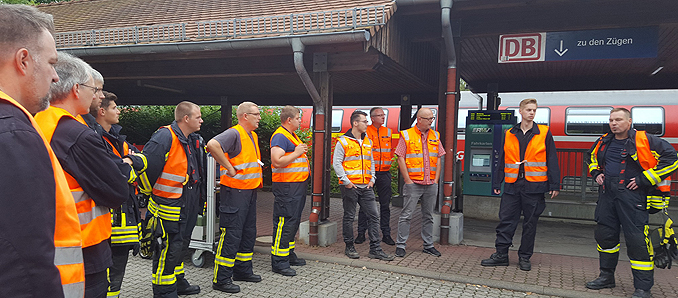 Übungsleiter Markus Stegemann hatte drei verschiedene Übungen vorbereitet. Dazu hatten die Notfallmanager zwei Nebengleise sperren und einen Zug bereitstellen lassen. Zuerst galt es, eine verletzte Person zu retten, die unter dem Triebwagen eingeklemmt war. Bei der zweiten Übung wurde ein Brand in einem Wagen mit vermissten Personen und Rauch in zwei Wagen ausgegangen. Die Wagen wurden dafür mit einer Nebelmaschine mit Rauch versehen. Drei Trupps unter Atemschutz suchten die Wagen ab und retteten die vermissten / verletzten Personen aus dem Gefahrenbereich . Außerdem wurde der Löschangriff vorbereitet und eine Schlauchleitung gelegt.