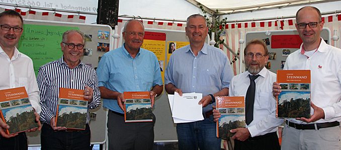 Peter Detig stellte heraus, dass es den Verantwortlichen, die Mitgliedern des Arbeitskreises und die Redakteure es als ihre Aufgabe und Verpflichtung betrachteten, das Wissen über unsere Wurzeln, über die Geschichte, die Vergangenheit und die Entwicklung der örtlichen Gegebenheiten sowie der hier lebenden Einwohner den nachfolgenden Generationen zu überliefern und so zu bewahren. Landrat Bernd Woide lobte den Zusammenhalt der Steinwänder, die trotz der verzweigten Lage der Streusiedlungen in vorbildlicher Weise die Gemeinschaft pflegen würden. Er bescheinigte dem Arbeitskreis Dorferneuerung mit der Erstellung der Chronik eine großartige Leistung und übergab den Förderbescheid für die anteilige Finanzierung des Heimatbuches.