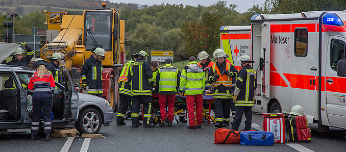Ein Wendemanöver auf der Bundesstraße bei Großenlüder im Landkreis Fulda endete in einem schweren Unfall: Ein Mann fuhr mit seinem Pkw an der Anschlussstelle Großenlüder-Industriepark auf die B254 auf und wollte kurz darauf wenden. Dabei übersah er jedoch einen herannahenden Mobilkran, der den Wagen an der Fahrerseite erfasste. Der Pkw-Fahrer wurde in dem Wrack eingeklemmt und musste von der Feuerwehr mit schwerem Gerät befreit werden. Er erlitt schwerste Verletzungen und wurde in ein Krankenhaus gebracht. Seine Ehefrau auf dem Beifahrersitz und der Kranfahrer wurden leicht verletzt. Aufgrund der Rettungs- und Aufräumarbeiten sowie der Landung des Rettungshubschraubers, der einen Notarzt zur Unfallstelle brachte, musste die B254 voll gesperrt werden. Es kam zu Verkehrsbehinderungen. Die Polizei hat weitere Ermittlungen zum Unfall aufgenommen. +++