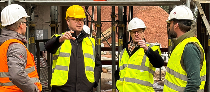 Auf der Baustelle wird derzeit intensiv am Rohbau gearbeitet. Die bisherigen Zahlen verdeutlichen die Dimension des Projekts: Rund 52.000 Kubikmeter Erde wurden ausgehoben, etwa 23.000 Kubikmeter Beton und rund 4.500 Tonnen Bewehrungsstahl sind bereits verbaut. Seit rund zwölf Monaten läuft der Rohbau, aktuell sind etwa 60 Arbeitskräfte vor Ort tätig. Nach umfangreichen Erd- und Gründungsarbeiten wächst das Gebäude seit dem vergangenen Winter Geschoss für Geschoss. Der Bau liegt weiterhin im vorgesehenen Zeit- und Kostenrahmen. Sandow betonte, dass dies trotz herausfordernder Rahmenbedingungen im Bausektor möglich sei und insbesondere der guten Zusammenarbeit mit den beauftragten Firmen zu verdanken sei.