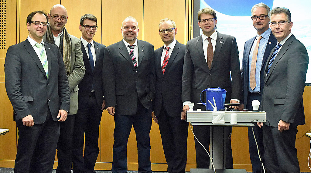 (von links) RhönEnergie-Breitbandchef Jens Schilling, Wirtschaftsförderer Bruno Günkel (Landkreis Fulda), Clustermanager Christian Vey, Regionalmanager Christoph Burkard, Bürgermeister Dag Wehner, Erster Kreisbeigeordneter Dr. Heiko Wingenfeld, Breitbandberater Andreas Gerhardt und RhönEnergie-Geschäftsführer Martin Heun.