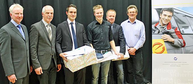 Johannes Burkart, Michael Brehl, Lukas Raab, Jonas Burkart, Gert Röder (GF Fa. Kerbl), Albert Berger (Fachbereichsleiter BBZ Fulda) (Es fehlt Stanislaw Reiswich)