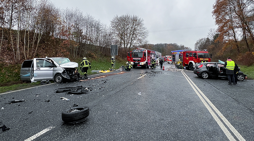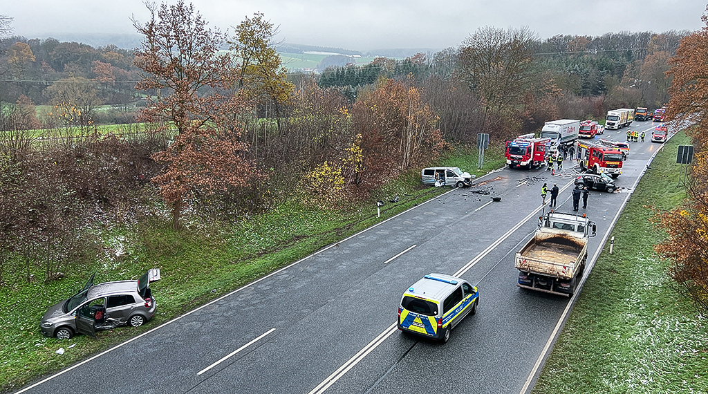 Zu einem schweren Unfall kam es am Montagvormittag gegen 9.45 Uhr auf der B254 im Bereich Bimbach. Eine Frau aus der Gemeinde Künzell wurde bei dem Unfall so schwer verletzt, dass sie wenig später verstarb. Die Bundesstraße ist aufgrund der Rettungs- und Bergungsarbeiten aktuell voll gesperrt. Nach ersten Informationen von vor Ort geriet eine 76-jährige Ford-Fahrerin aus der Gemeinde Künzell aus noch ungeklärter Ursache auf die Gegenfahrbahn und stieß dort frontal mit einem Mercedes Vito, der von einem 62-Jährigen aus Wertheim gesteuert wurde, zusammen. Dann fuhr noch ein VW Golf, an dessen Steuer ein 38-Jähriger aus der Gemeinde Großenlüder saß, in die Unfallstelle. Die Ford-Fahrerin wurde so schwer verletzt, dass sie wenig später verstarb. Der Mercedes Fahrer erlitt schwerste Verletzungen. Der Golf-Fahrer wurde schwer verletzt. Vor Ort waren mehrere Notärzte und Rettungswagen sowie die Polizei und Feuerwehr. Ein Gutachter wurde zur Unfallstelle gerufen. Die B254 ist aktuell noch voll gesperrt. Der Verkehr wird für beide Fahrtrichtungen abgeleitet. +++