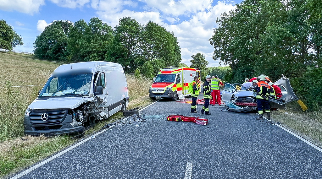 Der 40 Jahre alte Fahrer des Sprinters konnte selbst aus seinem Fahrzeug aussteigen, erlitt jedoch bei dem Unfall schwere Verletzungen und musste in ein Krankenhaus gebracht werden. Die Rentnerin wurde in ihrem Pkw eingeklemmt und lebensgefährlich verletzt. Feuerwehrkräfte mussten eine Crashrettung einleiten, um die Schwerstverletzte schnellstmöglich aus dem Wrack zu befreien. Die 82-Jährige wurde anschließend mit einem Rettungshubschrauber in eine Klinik geflogen.