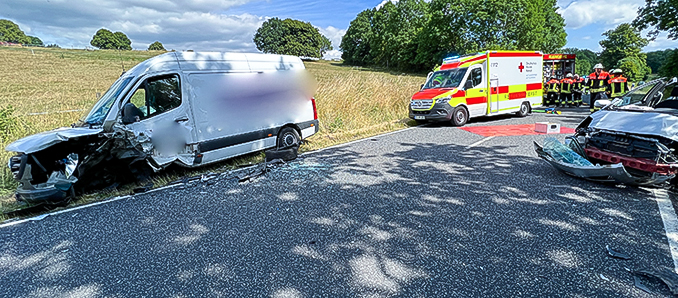 Schwerer Verkehrsunfall bei Herbstein im hessischen Vogelsbergkreis: Eine 82-Jährige geriet mit ihrem Toyota auf der K109 in den Gegenverkehr, so dass der Pkw frontal mit einem entgegenkommenden Kleintransporter kollidierte. Der Pkw wurde zerstört und kam auf der Fahrbahn zum Stehen, der schwer beschädigte Transporter rutschte in den Seitenraum.