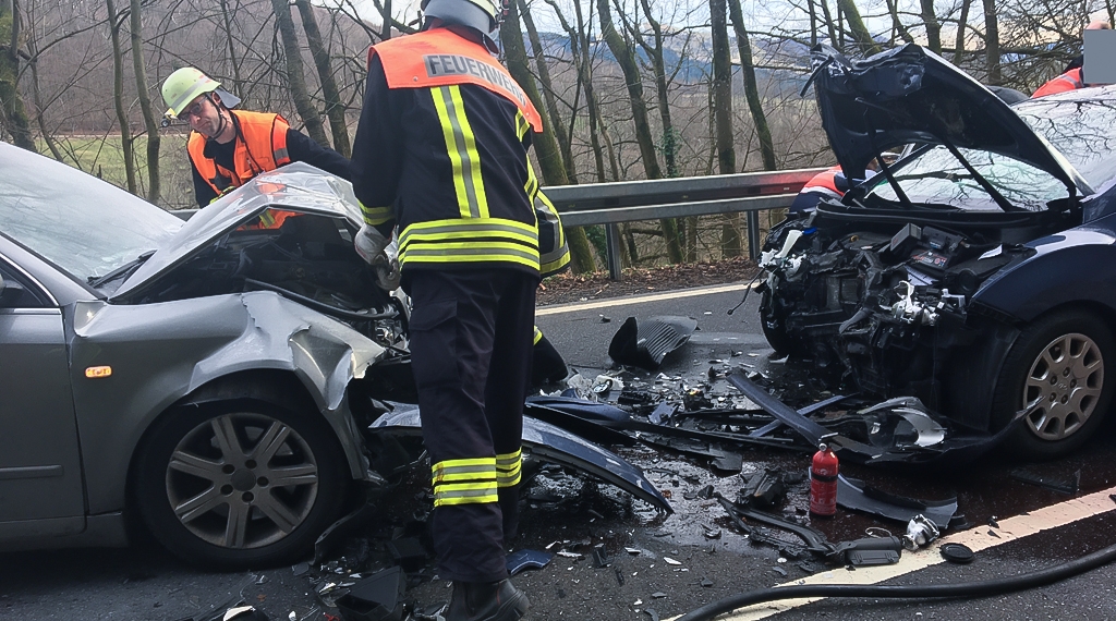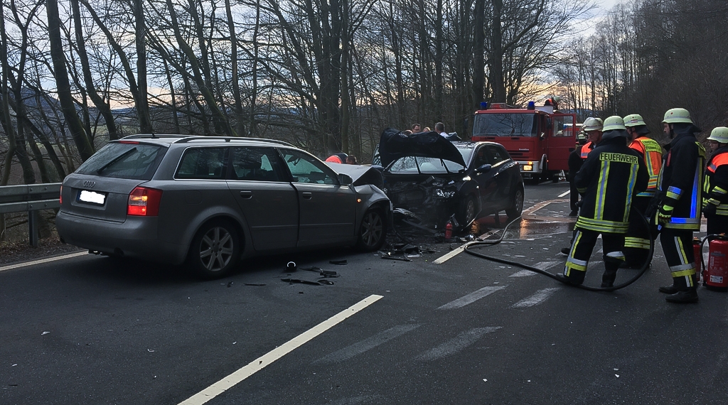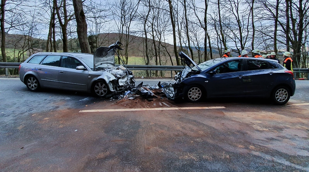 Am Sonntagnachmittag kam es gegen 14:30 Uhr auf der B458 zwischen Grabenhöfchen und Steinwand zu einem schweren Verkehrsunfall. Der 36-jährige Fahrer eines Pkw Audi kam aus noch ungeklärter Ursache am Ausgang einer Rechtskurve auf die Gegenfahrbahn und stieß dort frontal mit einem entgegenkommenden Pkw Hyundai zusammen. Der 61-jährige Fahrer des Pkw Hyundai und seine 58-jährige Beifahrerin, beide aus dem Landkreis Fulda, wurden bei dem Unfall schwer verletzt. Der Fahrer des Pkw Audi und sein 5-jähriger Sohn, ebenfalls aus dem Landkreis Fulda, erlitten leichte Verletzungen. Die B458 war für ca. 2 Stunden voll gesperrt. Drei Rettungswagen, ein Notarzt und 25 Kameraden der Feuerwehren Poppenhausen und Steinwand waren im Einsatz. +++