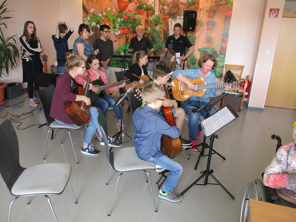 Zu Beginn der musikalischen Frühlingsreise, trugen die Nachwuchsmusiker Dominik und Victoria ihr Können vor. Unterstützt und begleitet wurden sie hierbei von dem Dipl.-Musiktherapeuten Ulrich Balzer von der Musikschule Klee. Die Gitarrengruppe um Tanja Ackermann, ebenfalls an der Musikschule Klee engagiert, nahm dann die Anwesenden mit auf eine musikalische Tour in ferne Länder dieser Erde. Dass es auch im Erwachsenenalter möglich ist, noch ein Instrument zu erlernen, zeigte Thomas Plur eindrucksvoll an der Gitarre – dieser bei dem ein oder anderen mit seinem „Halleluja“ für emotionale Momente sorgte.