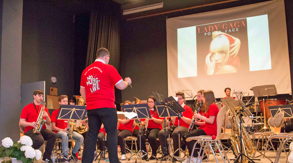 Nun zeigte das Jugendorchester des Vereins „Dee joonge Moarbicher“ mit 11 jungen Musikerinnen und Musikern, welche noch Unterstützung durch Mitglieder des Stammorchester erhielten, unter Leitung von Markus Jahn sein können. Die diesjährigen Stücke des Jugendorchesters standen ganz im Zeichen der aktuellen Charts und es gab auch einen Ausflug in die Welt von Walt Disney. Mit „Poker Face“ von Stefani Germanotta, besser bekannt als Lady Gaga, begann das Jugendorchester seinen Auftritt. Im Anschluss hieran folgte „What makes you beutiful“ von One Direction. Komponiert wurde dieses Stück von Savan Kotecha, Carl Falk und Rami Yacoub. Mit „All about the Bass“ von Meghan Trainor war das Jugendorchester schon bei seinem vorletzten Stück angelangt. Als letztes Stück spielten sie „Highlights from Planes“ die Titelmelodie des gleichnamigen Walt Disney Films „Planes“. Komponiert wurde dieses Stück von Mark Mancina. Zu Beginn des zweiten Teils sang der Chor Vox Juventatis unter Leitung von Brigitte Dechant. Mit dem Stück „Gospel Forever“ von Daniel Kasmalski gab Vox Juventatis den Zuhörerinnen und Zuhörern schon einen kleinen Vorgeschmack auf die noch folgenden Stücke. „Schackles“ von Mary Mary, arrangiert von Tine Ohrt og Sono kam direkt im Anschluss hieran und man war gespannt, was als nächstes Stück folgen würde. Es folgten noch „The Potters Hand“ von Darlene Zschech in einer Bearbeitung von Nanni Byl, „In your Arms“ Traditional arranged by Tyndale Thomas MBE und „Love lifted me“ von Calvin Bridges und Tore W. Aas in einer Bearbeitung von Nanni Byl. Die Solos sangen Jutta Böhm und Thomas Schmitt.