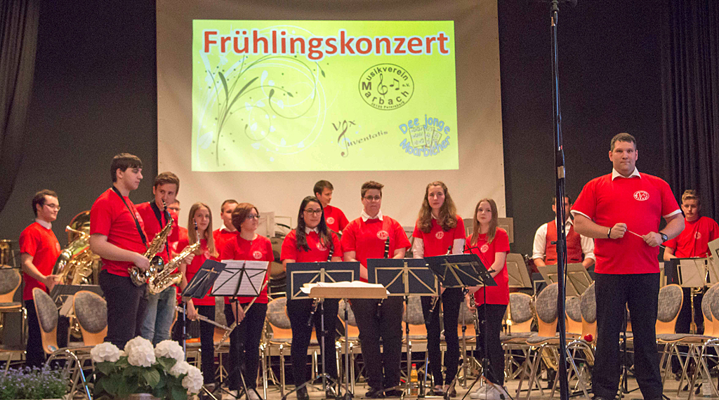 Marbach. In die Frühlingszeit tauchten die Zuhörerinnen und Zuhörer schon beim Betreten des Konrad-Trageser-Hauses ein. In diesem Jahr war das Konrad-Trageser-Haus ganz im Zeichen des Frühlings geschmückt. Schon bei der Begrüßung durch den 1. Vorsitzenden Andreas Raub zeigte sich, dass die Musikerinnen und Musiker ein ereignisreiches Jahr 2015 hinter sich hatten. Im Jahr 2015 hat der Musikverein Marbach e.V. einen neuen Dirigenten bekommen und steht seitdem unter der Leitung von Markus Klüber. Dies war auch der Grund, warum es im vergangenen Jahr kein Konzert gab. Daher freuten sich die 36 Musikerinnen und Musiker ganz besonders auf diesen Abend, da die Probenarbeit für das Konzert schon im letzten Jahr begonnen hatte und man ganz gespannt auf die Reaktionen des vollbesetzten Konrad-Trageser-Hauses war.