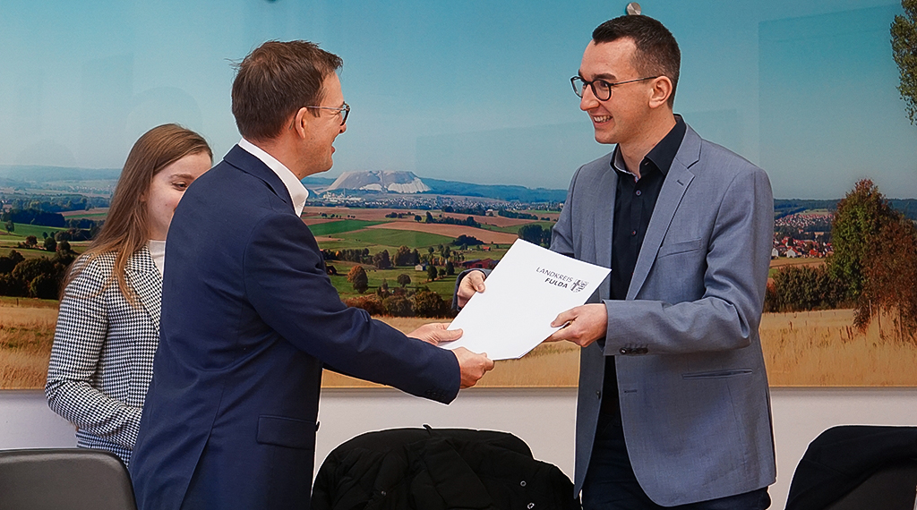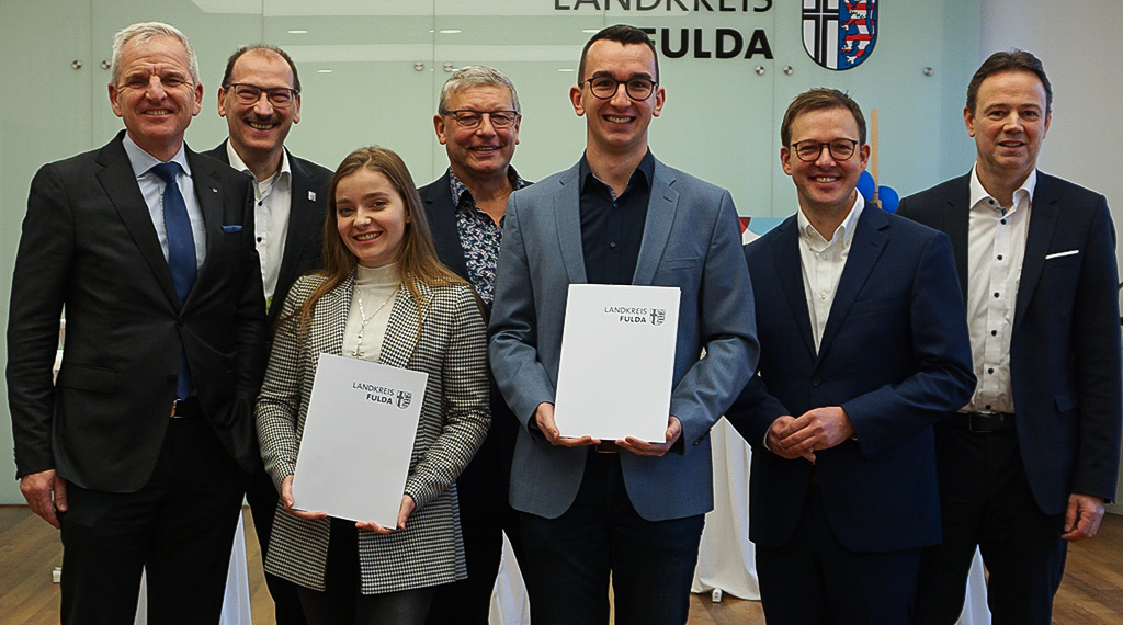 Zur Gewinnung von medizinischem Nachwuchs in der Region Fulda hat sich der Landkreis Fulda seit einigen Jahren auf den Weg gemacht und das sogenannte „Fulda-Stipendium“ ins Leben gerufen. Vom Stipendium profitieren Studierende der Humanmedizin, die sich für eine mindestens dreijährige ärztliche Tätigkeit im Landkreis Fulda verpflichten. Die monatliche Zuwendung in Höhe von 500 Euro soll es den Nachwuchsmedizinerinnen und Nachwuchsmedizinern ermöglichen, sich intensiv auf ihr Studium zu konzentrieren, um innerhalb der Regelstudienzeit (12 Semester) ihren Abschluss zu absolvieren. Finanziert wird das Stipendium vom Landkreis Fulda und den drei Krankenhäusern der Region (Klinikum Fulda gAG, Herz-Jesu-Krankenhaus Fulda gGmbH, Helios St. Elisabeth Klinik Hünfeld). Zwei von fünf weiteren Fulda-Stipendien konnte Gesundheitsdezernent Frederik Schmitt heute an die 23-jährige Laura Henkel und den 26-jährigen Nico Zentgraf übergeben.