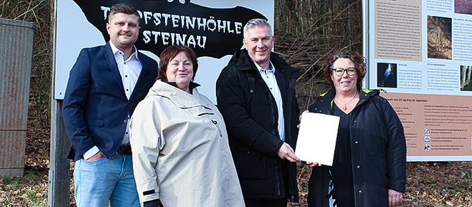 Vegard Schüch (Amt für Umwelt, Naturschutz und ländlicher Raum), Sabine Jennert (Spessart regional), Bürgermeister Christian Zimmermann und Erste Kreisbeigeordnete Susanne Simmler bei der Übergabe des Förderbescheids für die Tropfsteinhöhle. (v.l.)