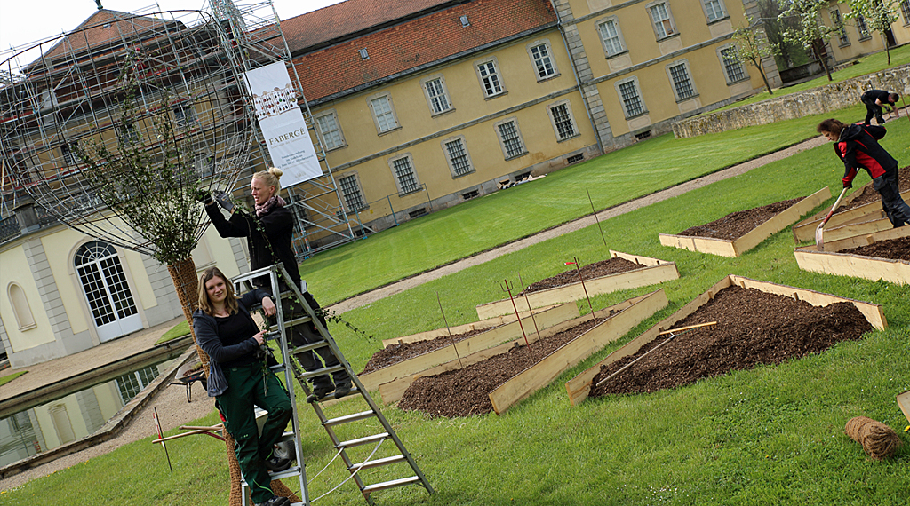 „Es ist mittlerweile ja schon längst Tradition, dass alljährig – zum Fürstlichen Gartenfest, welches ja immer unter einem bestimmten Motto, unter einem bestimmten Sonderthema steht, auch immer ein Schaugartenwettbewerb, dessen Arbeitstitel gleich dem Sonderthema ist, stattfindet. In den letzten Jahren hatten wir überwiegend junge Menschen, die an diesem teilnahmen und das hat uns darin bestärkt, dieses Jahr unseren Schaugartenwettbewerb, als ‚reinen Nachwuchswettbewerb‘ auszuschreiben. Wir haben diesbezüglich alle Hochschulen angeschrieben, an diesen der Studiengang Landschaftsarchitektur angeboten wird – fünf Hochschulen aus der Bundesrepublik haben sich letztlich am Wettbewerb beteiligt. Im Dezember letzten Jahres tagte hier auf Fasanerie eine hochkarätige Fachjury, die alle aus der Branche Garten- und Landschaftsbau kommen und dementsprechend wissen, wovon sie reden. Wir hatten Einsendungen von ‚schiefen Türmen von Pisa‘ und ‚venezianischen Gondeln‘ – da waren sehr schöne Entwürfe dabei, aber am Ende haben wir uns für Eva Schmidt und Henriette Deix mit Ihrem Entwurf der ‚Una Pizza Vegetariana‘, einer vegetarischen Pflanzenpizza mit einem großen Glas Wein, welches symbolisch für die italienische Lebensart steht, entschieden“, so Museumsdirektor Dr. Markus Miller.