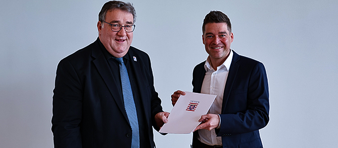 Regierungspräsident Mark Weinmeister freute sich, dass Fulda zusammen mit der Gemeinde Hilders zu den beiden ersten Kommunen gehört, die im Landkreis Fulda den Titel „Tourismusort“ führen dürfen. Damit ist die Stadt fortan auch berechtigt, einen Tourismusbeitrag zu erheben, um in die touristische Infrastruktur und das Marketing zu investieren und damit den Wirtschaftsfaktor Tourismus zu stärken. „Touristische Infrastruktur zu erhalten und auszubauen nutzt langfristig allen Beteiligten“, sagte Weinmeister anlässlich einer kleinen Feierstunde im Regierungspräsidium Kassel. „Zufriedene Gäste kommen wieder, Unternehmen können mit intakter touristischer Infrastruktur und guten Freizeitangeboten werben, und auch für Einwohnerinnen und Einwohner der Tourismusorte selbst ist ein attraktives Umfeld ein Gewinn.“ Weinmeister überreichte die Urkunde zur Verleihung des Prädikats an Amtsleiter Dominik Höhl (Amt für Tourismus- & Marketingmanagement der Stadt Fulda).