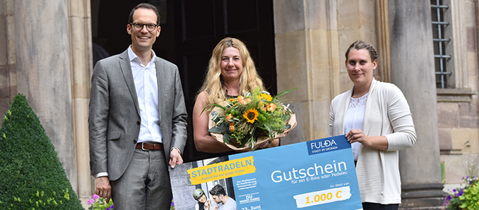 Einen besonderen Anreiz zur Teilnahme bildet in jedem Jahr ein Gutschein-Preis im Wert von 1000 Euro, der unter allen Teilnehmerinnen und Teilnehmern verlost wird – ganz unabhängig von der individuellen Kilometerleistung. In diesem Jahr traf das Glücklos Corinna Aschenbrücker aus Oberrode. Sie radelte für das Team der Sparkasse Fulda und war auch über einen Post im Intranet ihres Arbeitsgebers auf den Wettbewerb aufmerksam geworden. Sie ist schon in der Vergangenheit gelegentlich mit dem Rad an die Arbeit gefahren, hat aber ihren sportlichen Ehrgeiz jetzt zum „Stadtradeln“ noch einmal gesteigert. „Es ist ein Umsteigen aus Spaß“, sagt sie: „Manchmal ist es morgens noch recht frisch, aber ich komme immer gut gelaunt an der Arbeit an“, erzählt Aschenbrücker, „und ein paar Tage lang hatte ich am Radweg immer einen Feldhasen als Begleiter. Das war natürlich ein ganz besonderes Erlebnis, was man mit dem Auto wohl niemals haben wird.“ Sie steige nur noch dann auf vier Räder um, wenn die Regen-App stärkere Niederschläge für den Tag voraussagt, erzählte die Preisträgerin. Da sie sich gerade erst in Sachen E-Bike neu ausgerüstet habe, werde sie den Gutschein für ein Pedelec oder ein E-Bike übrigens an ihre Tochter Julia weitergeben, kündigte Aschenbrücker an.