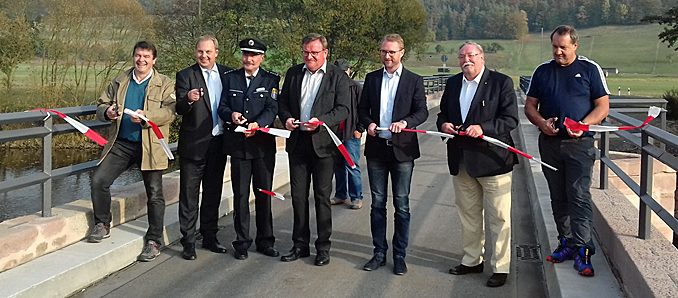Die umfangreichen Instandsetzungsarbeiten an der Fuldabrücke im Verlauf der K 80 bei Schlitz/Pfordt sind abgeschlossen. Dr. Jens Mischak, Erster Kreisbeigeordneter des Vogelsbergkreises und der Regionale Bevollmächtigte von Hessen Mobil für Mittelhessen, Ulrich Hansel, Bürgermeister Hans-Jürgen Schäfer und Ortsvorsteher Herbert Schlosser haben heute gemeinsam das Bauwerk und somit auch die Kreisstraße wieder für den Verkehr freigegeben.