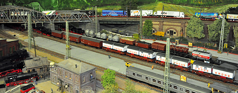 Vorgeführt werden Lokomotiven und Wagen aus fast allen Bahnepochen. Das beginnt mit der Zeit der Deutschen Reichsbahn Gesellschaft (DRG) Anfang der zwanziger Jahre, geht über die Anfänge der Deutschen Bundesbahn nach 1945 und endet beim neuesten ICE der DB AG. Eine Straßenbahn verbindet im Pendelverkehr den großen Durchgangsbahnhof in der Unterstadt mit der Oberstadt auf der Anhöhe. Über eine Nebenbahnstrecke verbinden typische Züge den großen Bahnhof mit dem Bergdorf auf dem gegenüber gelegenen Anlagenteil. Auf der MEC-Anlage herrscht nicht nur reger Fahrbetrieb; zahlreiche Details in Ortschaften und Landschaft vermitteln viel bahntypische Atmosphäre – eine gute Anregung für die Modellbahn daheim. Für eine prächtige Soundkulisse sorgt eine Reihe von Zügen, die mit Soundmodulen ausgestattet sind. Auch die Glocken der Stadtkirche läuten regelmäßig und stimmen in das Geräuschkonzert mit ein.