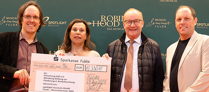 Beim diesjährigen Fuldaer Musical Sommer konnte eine Spendensumme von 12.330 Euro für „Forschung hilft“, die Stiftung zur Förderung der Krebsforschung am Universitätsklinikum Würzburg (UKW), zusammen. Ende August überreichte der geschäftsführende Gesellschafter der spotlight musicals GmbH, Peter Scholz, den Spendenscheck über 12.330 Euro an die Stiftung „Forschung hilft“. Die Stiftung fördert besonders aussichtsreiche Krebsforschungsprojekte am Uniklinikum Würzburg. Realisiert werden konnte der Spendenbetrag durch die Vermittlung des „Lions Clubs Fulda“ vom Team des Musicals „Robin Hood“, das beim diesjährigen Musicalsommer Fulda gespielt wurde. Am Ende von vielen Vorstellungen des dreimonatigen Festivals in Fulda sammelten die Ensemble-Mitglieder bei den Besucherinnen und Besuchern Spenden.