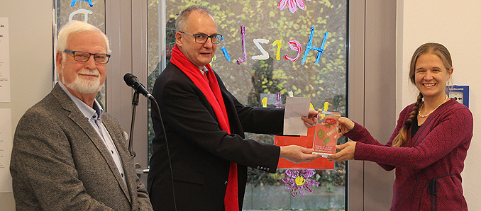 „Das heutige Familienzentrum Lutherkirche ist ohne einen Blick auf die Geschichte der Lutherkirche und ihres sozialen Umfeldes nicht erklärbar“, führte Laudator Bernhard Lindner aus. Der Sozialdemokrat weiter: „Zu Beginn des 19. Jahrhunderts gab es zwei entscheidende Entwicklungen: Zum einen säkularisierte Napoleon die katholische Kirche mit ihren Klöstern und öffentlichen Einrichtungen. Nachdem dann Hessen-Kassel die Macht in Fulda übernahm, zogen viele Protestanten in die Barockstadt. Die evangelische Gemeinde wuchs. Zweitens - und das ist die nachhaltig wichtigere Entwicklung - war die Industrialisierung im Süden Fuldas. Dies zog viele Arbeitskräfte an, die zum großen Teil evangelischen Glaubens waren. Im ehemaligen Möbelhaus Fink und Vogel schräg gegenüber der Lutherkirche fanden Gottesdienste im damaligen ‚Wohnzimmer‘ statt. Auch diese Räumlichkeiten wurden zu klein. So wurde der Kirchenbau beschlossen und am heutigen Standort ein Grundstück gekauft. Ein feuchter Entenpfuhl mit Schutt und Müll aufgefüllt. Damit ein Kirchenbau stabil gegründet werden konnte, wurden Pfeiler in den weichen Grund gerammt, worauf dann der Kirchenbau hochgezogen werden konnte. 1934 wurde die Kirche eingeweiht. Der Chronik zur Kirche ist zu entnehmen, dass diese Zeremonie begleitet wurde durch Hitlergruß. Die Deutsche Kirche hinterließ ihre Spuren.