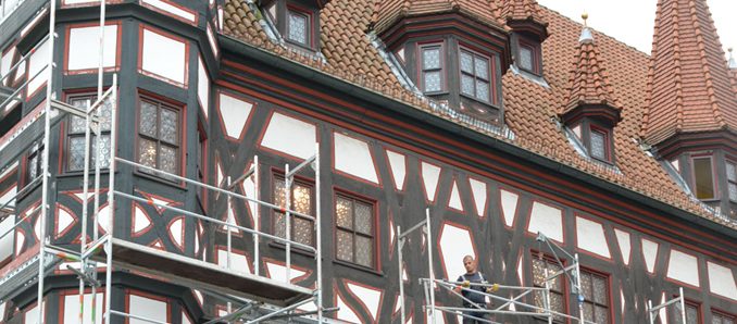 „Wir müssen die Fassade grundhaft sanieren und im Zuge dessen werden kleine Bauunterhaltungsmaßnahmen an den Dachflächen vorgenommen“, so umschreibt es Frank Volmer, Leiter des städtischen Gebäudemanagements. Durch die Pflaster- und Umbauarbeiten rund um den Borgias- und Universitätsplatz sowie die normalen witterungstechnischen Einflüsse der letzten Jahrzehnte ist die Fassade des denkmalgeschützten Gebäudes in Mitleidenschaft gezogen worden. Neben dem Streichen der Holzfachwerkskonstruktion sowie der Holzfenster werden auch eine Fassadenreinigung, Anstriche der Gefache und Putzflächen sowie eine Erneuerung der Giebelwettbretter vorgenommen. An der besonders aufwendig gestalteten Dachkonstruktion werden u.a. Gauben ausgebessert und aufgrund der erhöhten Verwirbelung der Luft Gratziegel gesichert und sturmfest gemacht.