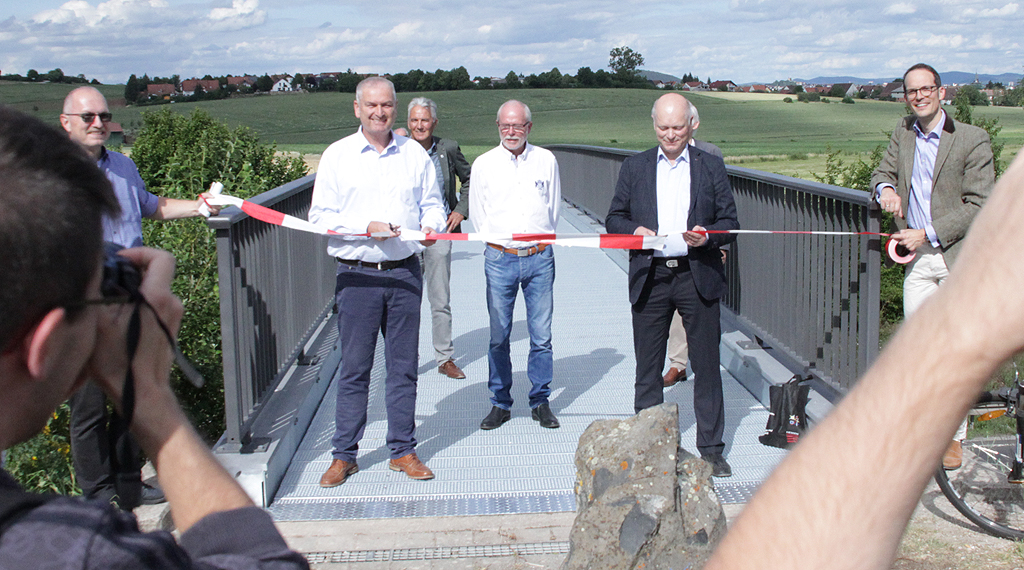 Nach rund zweieinhalbjähriger Bauzeit wurde die Fußgängerbrücke über die Kreisstraße 110 (Westring Fulda) in Höhe des Haimbergs bei Fulda-Haimbach im Beisein von Landrat Bernd Woide (CDU), Stadtbaurat Daniel Schreiner (parteilos) sowie Vertretern des Straßen- und Verkehrsmanagements Hessen Mobil am Freitag (03.07.2020) ihrer Bestimmung übergeben. Die alte Brücke wurde im Dezember 2017 durch einen Lkw so stark beschädigt, so dass diese abgerissen werden musste. Nachdem nun eine neue Stahlbrücke für Fußgänger und Radfahrer errichtet wurde, sind die Bauarbeiten am Bauwerk, das die Naherholungsgebiete Haimberg und Schulzenberg miteinander verbindet, nun abgeschlossen.