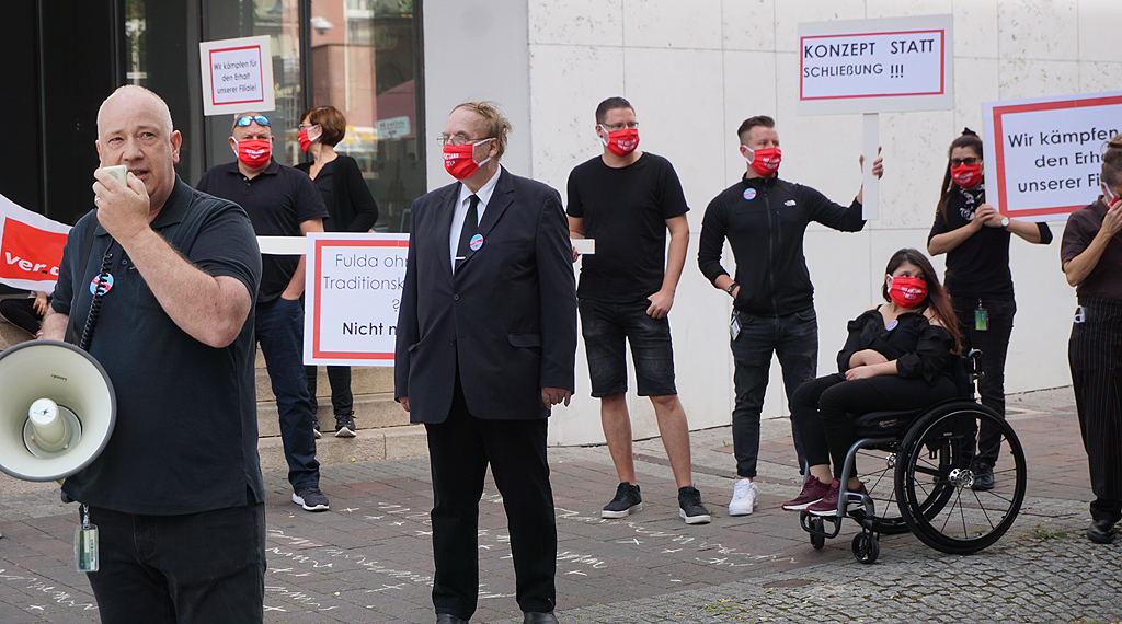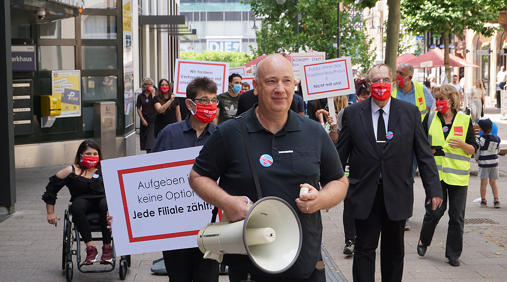 „Nehmt uns von der Liste und kämpft um diese Filiale“, sagte heute Betriebsratsvorsitzender Michael Kretsch, der unter anderem „Verhandlungen mit dem Vermieter“ forderte. Schon seit einiger Zeit läge ein Konzept vor, um in Fulda zwei Warenhäuser – Galeria Kaufhof- Filiale und die Karstadt-Filiale (Universitätsplatz) – fortführen zu können, zumal es sich bei der betroffenen Filiale, die geschlossen werden solle, um ein „Traditionskaufhaus mit einer über 80-jährigen Geschichte am Standort Rabanusstraße“ handele. Die Leidtragenden seien die Mitarbeiter, auf deren Schultern jahrelange Versäumnisse nun ausgetragen würden. Die Lage für die Mitarbeiterinnen und Mitarbeiter von Galeria Kaufhof in Fulda sei prekär. Nicht abzusehen sei es, wann ihnen nun gekündigt werde, wie hoch Abfindungen oder mögliche Übernahmen aussehen. Für die Betroffenen nicht auszustehen, wie mit ihnen verfahren werde. Und dennoch gingen diese seit dem bekannt wurde, dass ihre Arbeitsstätte schließen soll, jeden Tag motiviert an die Arbeit. „Die Öffentlichkeit soll erfahren, wie mit ihnen umgegangen wird“, so Kretsch.