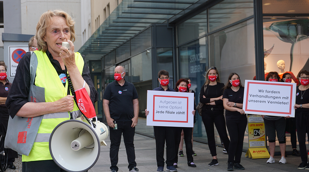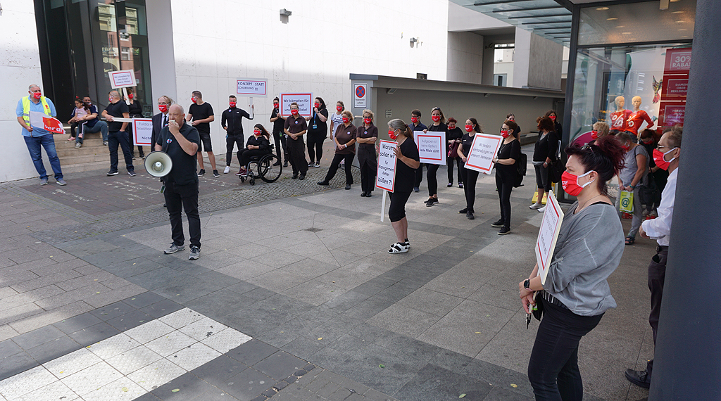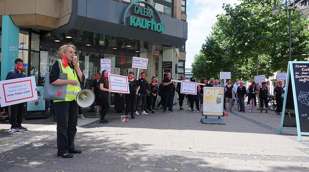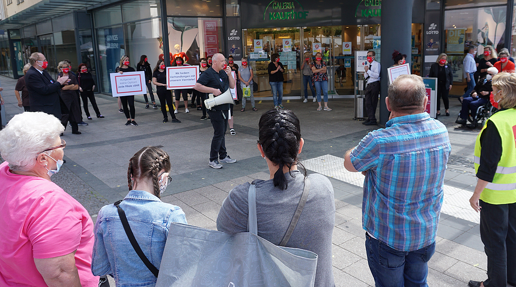 Dunkel gekleidet und Corona konform hielten die Betroffenen Schilder mit den Aufschriften „Wir fordern Verhandlungen mit unserem Vermieter“, „Aufgeben ist keine Option, Jede Filiale zählt!“ oder „Wir kämpfen für den Erhalt unserer Filiale!“ in die Höhe. „Wer kämpft, kann verlieren, wer nicht kämpft, hat schon verloren“, motivierte ver.di-Gewerkschaftssekretärin Mechthild Middeke die Arbeitnehmerinnen und Arbeitnehmer. Middeke forderte den Haupteigentümer des Unternehmens Galeria Karstadt Kaufhof, René Benko, dazu auf, in das Unternehmen zu investieren. Genug Geld, so Middeke, habe er auf der Kante. Die Warenhäuser, so die Gewerkschaftssekretärin weiter, seien „Ankerpunkte für den innerstädtischen Handel“.
