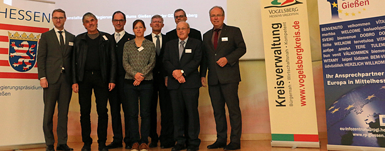 v. l.: Erster Kreisbeigeordneter Dr. Jens Mischak, Dr. Heino Rudolf (hrd.consulting), Regierungspräsident Dr. Christoph Ullrich, Daniela Hogrebe (Koordinierungsstelle der GDI-DE), Prof. Dr. Gerd Buziek (Esri Deutschland Group GmbH), Prof. Robert Seuß (Institut für Kommunale Geoinformationssysteme e. V.), Udo Harzer (Geschäftsführer GDI Vogelsberg) und Dipl.-Ing. Udo Stichling (Präsident Deutscher Dachverband für Geoinformation e. V.) Foto: Gaby Richter