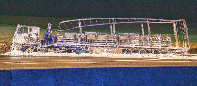 Der Sattelzug brannte vollständig aus. Die Bergungsarbeiten werden wohl noch die ganze Nacht hindurch andauern. Außerdem muss vermutlich die Fahrbahn aufwendig gereinigt und auch das kontaminierte Löschwasser muss von der Autobahn abgepumpt und speziell entsorgt werden. Der durch den Brand angerichtete Schaden liegt nach ersten vorsichtigen Schätzungen der Polizei im hohen sechsstelligen Bereich. Es bildete sich in beiden Richtungen ein kilometerlanger Stau, es kam die ganze Nacht hindurch zu massiven Verkehrsbehinderungen in der Region. +++ [su_112]