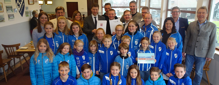 Große Freude bei den SKG-Kindern, Trainern, Vereinsverantwortlichen, Planern und bei Bürgermeister Dr. Stefan Korell (hinten Mitte) eingerahmt von den Überbringern der Förderbescheide, Staatssekretär Dr. Stefan Heck (links) und EKB Frederik Schmitt (rechts). Foto: L. Rehnert