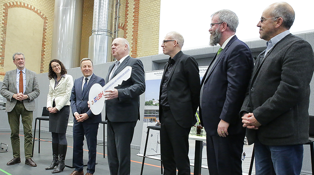 Hessens Ministerin für Wissenschaft und Kunst, Angela Dorn, hat heute gemeinsam mit dem Staatssekretär im Hessischen Ministerium der Finanzen, Dr. Martin J. Worms, Fuldas Oberbürgermeister, Dr. Heiko Wingenfeld, sowie dem Präsidenten der Hochschule Fulda, Professor Dr. Karim Khakzar, die neuen Gebäude auf dem Gelände der ehemaligen Mühle Heyl feierlich eröffnet. Zu den zahlreichen geladenen Ehrengästen aus den Bereichen Kunst, Bildung, Politik, Wirtschaft und Verwaltung zählten unter anderem der heimische Abgeordnete des Deutschen Bundestags, Michael Brand MdB, die hiesigen Abgeordneten des Hessischen Landtags, Silvia Brünnel MdL (Bündnis 90/Die Grünen) und Sebastian Müller MdL (CDU), Fuldas Stadtbaurat Daniel Schreiner, der Fuldaer Künstler Franz Erhard Walter, der Architekt Ole Creutzig vom Kasseler Architekturbüro „Atelier 30“, der ehemalige langjährige Hochschulratsvorsitzende, Dr. Michael Imhof, der Kanzler der Hochschule Darmstadt, Dipl.-Ing. Thomas Bartnitzki, der Kanzler der Hochschule RheinMain, Dr. Martin Lommel, der Fuldaer Unternehmer sowie direkter Nachbar zur Hochschule Fulda, Dipl.-Ing. Bernhard Juchheim (Gesellschafter des inhabergeführten Familienunternehmens JUMO), die Verwaltungsspitze der Klinikum Fulda gAG, Priv.-Doz. Dr. med. Thomas Menzel und Burkhard Bingel sowie der Ärztliche Direktor der Herz-Jesu-Krankenhaus Fulda gGmbH, Dr. med. Rüdiger Hacker. Als ehemalige Rektoren der damaligen Fachhochschule Fulda wurden Professor Dr. Joseph Dehler (1982 bis 1994) sowie der Gründungsrektor der Fachhochschule, Professor Dr. Tassilo Wettengl (1972 bis 1977), besonders begrüßt.