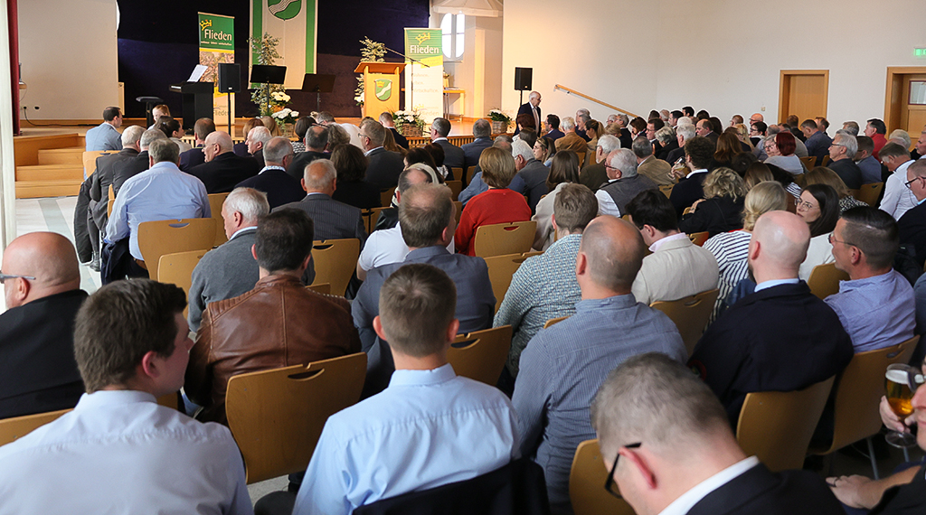 Die Entscheidung, den Jahresempfang nicht, wie sonst üblich, zum Jahresbeginn auszurichten, kam nicht von ungefähr, sondern fiel ganz bewusst, wie Fliedens Bürgermeister Christopher Gärtner (CDU) in seinen einleitenden Eröffnungs- und Begrüßungsworten ausführte. „Wir haben uns bewusst gegen einen Empfang im Januar entschieden, wo normalerweise bis zu drei Jahresempfänge in der Woche stattfinden, in der Hoffnung, dass die Menschen dann auch etwas ungebundener sind und etwas mehr Zeit haben“, so Bürgermeister Christopher Gärtner. Ein schweifender Blick durch den bis auf den letzten Sitzplatz gefüllten Saal bestätigte, dass dies offenbar die richtige Entscheidung gewesen ist; denn noch nie sei nach dem Gemeindeoberhaupt ein Jahresempfang der Gemeinde so gut besucht gewesen, wie gestern.