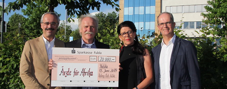 Weltweit setzen sich Rotary Clubs für das Gemeinwohl ein. In einem gemeinsamen Sozialprojekt unterstützen die Rotary Clubs Fulda, Fulda-Paulustor und Rhön die urologische Station eines Krankenhauses in Ghana. Sie stellen zwei neuwertige OP-Tische zur Verfügung und gewinnen erfahrene Mediziner, die freiwillig für einige Wochen Patienten operieren, denen sonst nicht geholfen würde. Partner der Rotarier ist die angesehene ortskundige Organisation „Ärzte für Afrika“. In einem ersten Schritt überreichten nun die amtierenden Präsidenten der drei Clubs dem stellvertretenden Vorsitzenden der Hilfsorganisation Erhard Rübsam einen Spendenscheck in Höhe von 20.000 Euro. Weitere Beträge werden folgen. Derweil ist die Beschaffung des OP-Tisches für Ghana bereits angelaufen. Bereits im Herbst 2019 werden erstmals deutsche Urologen an diesem Tischen operieren – zum Segen der mittellosen Patienten auf der langen Warteliste.