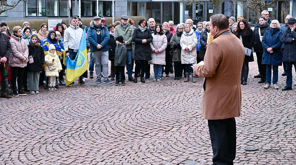 Bürgermeister Benjamin Tschesnok dankte allen, die gekommen waren, weil sie dieses unermessliche Leid nicht kalt lasse: "Mit dieser Mahnwache rufen wir zum Frieden auf. Zu einem gerechten Frieden, den die Völker nicht finden werden, so lange ein politischer Führer im Kreml Erfolg damit hat, seine Großmachtphantasien auszuleben." Auch er wandte sich gegen Kräfte, denen offensichtlich ein autoritärer Stadt nach dem Vorbild des Kremls lieber sei, als eine offene, eine menschliche, friedliche und demokratische Gesellschaft. Der Krieg mahne, auch nach innen in die Gesellschaft zu schauen. Deshalb stünden die Teilnehmer der Mahnwache auch für ihre Freiheit auf dem Anger. Tschesnok weiter: "Wir belassen es nicht bei Worten der Solidarität. Wir Hünfelder leisten auch ganz konkrete Hilfe gemeinsam mit unserer polnischen Partnerstadt Proskau. So haben wir Proskau dabei unterstützt, Ukrainische Kriegsflüchtlinge zu beherbergen. Wir haben Proskaus Partnerstadt in der Ukraine, Wyhoda südlich von Lemberg, ein gebrauchtes Feuerwehrfahrzeug übergeben, damit sie ihre Bürger und die Tausende von Binnenflüchtlingen in der Stadt besser schützen können. Mit unserem Partnerschaftsverein haben wir die Chance genutzt, über die Deutsche Gesellschaft für internationale Zusammenarbeit schweres technische Gerät zu organisieren, damit die Gemeinde in der Ukraine ihre vom Bombenterror der russischen Angreifer bedrohte Infrastruktur Instand halten kann. Das ist ganz konkrete zivile Hilfe, mit der wir einen kleinen Beitrag dazu leisten, den betroffenen Menschen beizustehen."