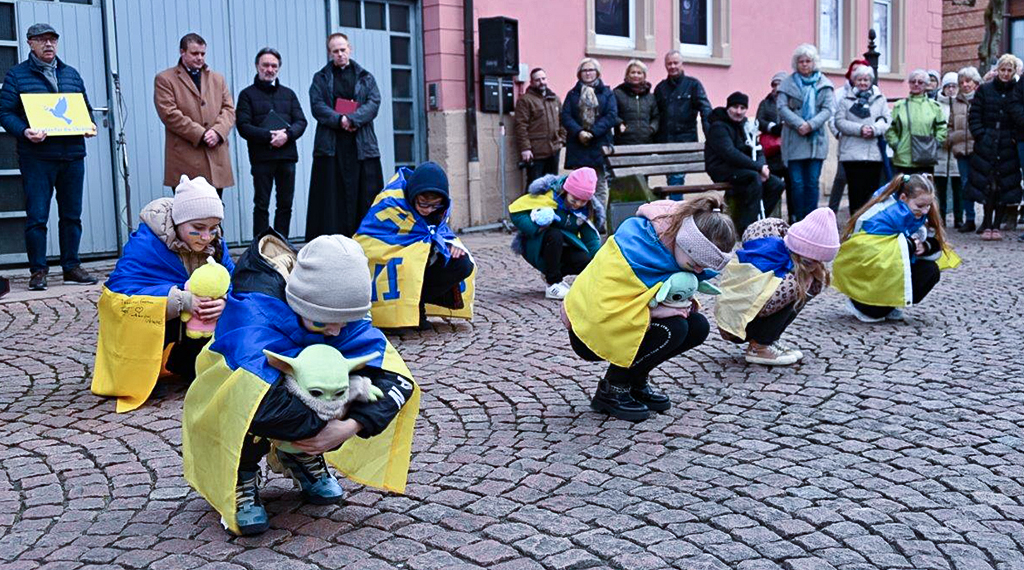 Beklemmend war die Performance von Ukrainischen Kindern bei der gemeinsamen Mahnwache aller Fraktionen der Hünfelder Stadtverordnetenversammlung auf dem Anger. Sie kauerten bei Sirenenalarm auf dem Pflaster, zeigten damit ihre Angst vor dem russischen Bombenterror. Kateryna Yakymenko und Stefanie Krys sagen von ihrer Sehnsucht nach ihrer Heimat und dem Frieden.