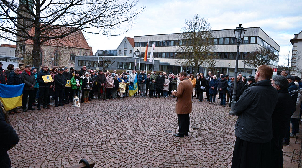 Aufgerufen hatten zu dieser Mahnwache alle in der Stadtverordnetenversammlung vertretenen Fraktionen von CDU, CWE, SPD, FDP und Bündnis 90, die Grünen. Für sie ergriff Stadtverordnetenvorsteher Berthold Quell das Wort mit der Forderung: "Putin, beende diesen Krieg, höre auf das Völkerrecht zu brechen und Europa zu spalten." Für die Stadtverordneten, deren Einladung über 200 Hünfelder gefolgt waren, sagte Quell, dass die Menschen in der Ukraine nicht alleine gelassen würden. Ukraine gehöre zu Europa. Mit deutlichen Worten trat Quell auch Gruppierungen an den Rändern des politischen Spektrums links und rechts entgegen, die diesen Krieg verharmlosten, rechtfertigten oder gar unterstützten. Er plädierte für Einigkeit in Europa als Wertegemeinschaft in einem gefestigten Staatenbund. Zerfalle Europa, stehe jedes Land alleine da und sei der Gier des Despoten Putin im Kreml schutzlos ausgeliefert.
